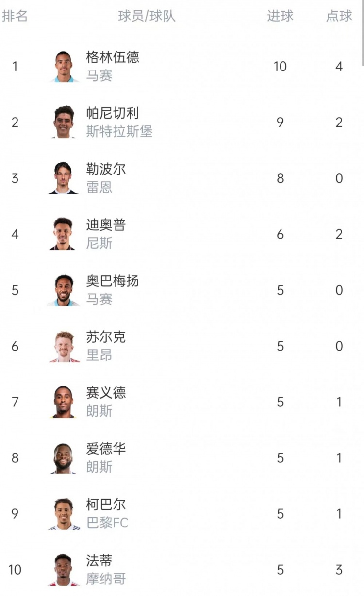 格林伍德本赛季出战12场法甲比赛,打进10球,登顶法甲射手榜。