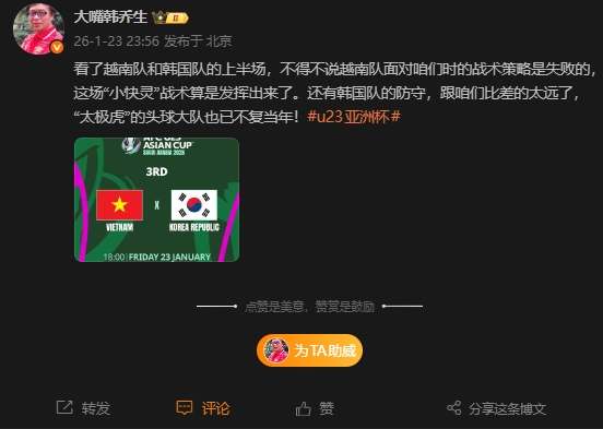 01月23日讯 2026年U23亚洲杯季军赛越南U23vs韩国U23,目前半场战罢,越南队1-0领先,主持人韩乔生在社媒点评。